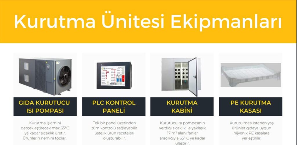 Kurutma kabininin içerisine yerleştirilen gıda kurutmaya uygun hijyenik kurutma kasalarına kurutulmak istenen ürünler yerleştirilir. Kurutucu ısı pompası ile kabinin içerisindeki ortam sıcaklığı max. 65°C’ ye veya istenen daha düşük sıcaklığa çıkartılır. Kurutma kabinimizin içerisindeki fanlar sayesinde cihazdan aldığı ısıyı eşit şekilde kurutma kabininin içine sirküle ederek kurutma gerçekleşir. Kasalara yerleştirilen gıda ürünlerinin içerisinde bulunan su, ortam ısındıkça buharlaşmaya başlar. Buharlaşan su, fanlar sayesinde ısı pompasına taşınır ve burada sıvı hale gelir.